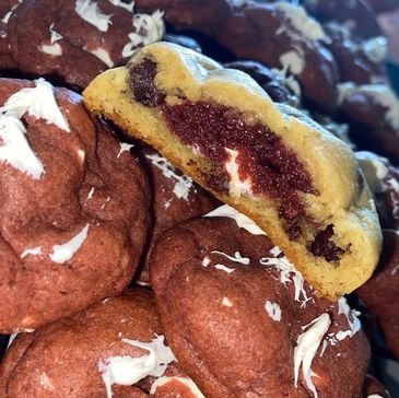 red velvet cookie dough inside our famous chocolate chip cookie